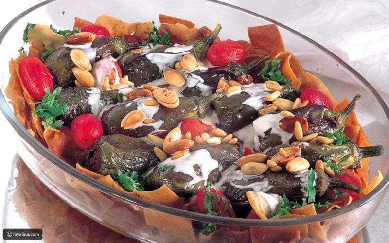 - بعد رص الباذنجان والعيش واللحم المفروم نضع فوقهم سلطة الزبادي وبعض المكسرات المحمصة وبالهناء والشفاء.